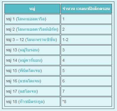 หมู่ธาตุที่มีเครื่องหมาย(*) ใช้แสดงว่าธาตุในหมู่ 18 ก๊าซมีกระกูล มีเวเลนซ์อิเล็กตรอน 8 ยกเว้น ฮีเลียม (He), มี 2 ตารางธาตุจัดแบ่งเป็น 18 หมู่ เม่อพิจารณาสมบัติของธาตุต่างๆในแต่ละหมู่พบว่า 2 หมู่ด้านซ้ายมือสุดของตารางธาตุมีสมบัติเป็นโลหะ เรียกว่า หมู่ 1A และ 2A ส่วน 2 หมู่ด้านขวามือสุดของตารางธาตุมีสมบัติเป็น อโลหะ เรียกว่า หมู่ 7A และ 8A ส่วนธาตุในหมู่ 3A ถึง 6A มีทั้งธาตุที่เป็น อโลหะ เช่น คาร์บอน (C) ไนโตรเจน (N) ออกซิเจน (O) และ ธาตุกึ่งโลหะ เช่น โบรอน (B) และซิลิคอน (Si) เป็นต้น ส่วน 10 หมู่ที่อยู่ตรงกลางของตารางธาตุ มีสมบัติทางกายภาพเหมือนโลหะ แต่มีสมบัติทางเคมีบางประการที่ต่างจากโลหะในหมู่ 1A และ 2A นักวิทยาศาสตร์จึงจัดแยกไว้ต่างหาก และเรียกธาตุใน 10 หมู่นี้ว่า โลหะแทรนซิชัน (transition metal) ความสัมพันธ์ระหว่างจำนวนธาตุในคาบต่างๆ กัลอิเล็กตรอนในระดับพลังงานต่างๆ เมื่อพิจารณาตารางธาตุจะเห็นว่า หมู่ 1A มีทั้งหมด 7 ธาตุ ซึ่งมีเลขอะตอมเป็น 1,3,11,19,37,55 และ 87 ถ้านักเรียนจัดอิเล็กตรอนของแต่ละธาตุเข้าในระดับพลังงานต่างๆ ตามหลักเกณฑ์ในตาราง 5.2 จะพบว่า ระดับพลังงานนอกสุดของทุกธาตุในหมู่ 1A มีอิเล็กตรอน 1 อนุภาคเหมือนกันหมด เรียกว่าธาตุในหมู่ 1A มีเวเลนซ์อิเล็กตรอนเท่ากับ 1 ในทำนองเดียวกัน ถ้านักเรียนจัดอิเล็กตรอนของธาตุต่างๆ ในหมู่ 2A ก็จะพบว่าธาตุในหมู่นี้ต่างก๊มีเวเลนซ์อิเล็กตรอนเป็น 2 และหมู่ 3A มีเวเลนซ์อิเล็กตรอนเป็น 3 เรื่อยไปจนถึงหมู่ 8A ก็มีเวเลนซ์อิเล็กตรอนเป็น 8 นั่นคือ จำนวนเวเลนซ์อิเล็กตรอนของธาตุในหมู่ 1A - 8A มีค่าตรงกับตัวเลขของหมู่นั้นๆ ขอบคุณเนื้อหาเพิ่มเติม |
