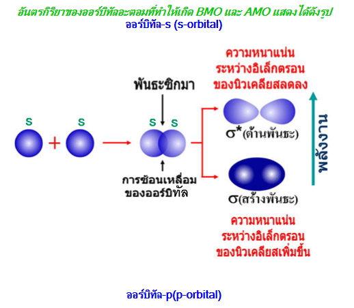 1. ออร์บิทัลโมเลกุลแบบสร้างพันธะ (bonding molecular orbital ; BMO) การเกิดออร์บิทัลโมเลกุลแบบนี้ จะทำให้อิเล็กตรอนมีพลังงานลดลง นั่นคือมีความเสถียรมากขึ้น