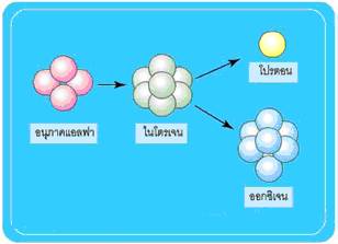 สมมติฐาน โปรตอน – อิเล็กตรอน กล่าวว่า นิวเคลียสประกอบด้วยโปรตอนและอิเล็กตรอน ซึ่ง สามารถอธิบายการแผ่รังสีแอลฟาได้ กล่าวคือ อนุภาคแอลฟาเกิดจากการรวมตัวกันระหว่างโปรตอน 4 ตัว และอิเล็กตรอน 2 ตัว แล้วหลุดออกมาจากนิวเคลียส ส่วนการแผ่รังสีบีตานั้นเกิดจากการปล่อย อิเล็กตรอน ในนิวเคลียสออกมา แต่จากหลักความไม่แน่นอนของไฮเซนเบอร์กข้อมูลนี้ชี้ให้เห็นว่า อิเล็กตรอนจะอยู่ใน นิวเคลียสไม่ได้ เนื่องจากมีพลังงานสูงมาก สมมติฐานจึงต้องยกเลิกไป ขอบคุณเนื้อหาเพิ่มเติม |