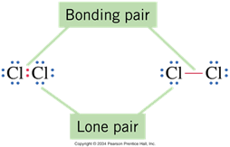 ในสารประกอบโคเวเลนต์ ภาพแสดงอิเล็กตรอนคู่พันธะ และอิเล็กตรอนคู่โดดเดี่ยวของโมเลกุล Cl2