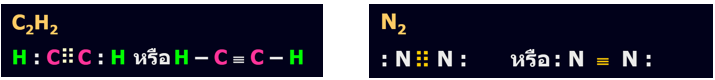 3. พันธะสาม (Triple bond) เป็นพันธะโควาเลนต์ที่เกิดจากอะตอมใช้อิเล็กตรอนร่วมกัน 3 คู่ ใช้เส้น 3 เส้น ( º ) แทนหนึ่งพันธะสาม เช่น