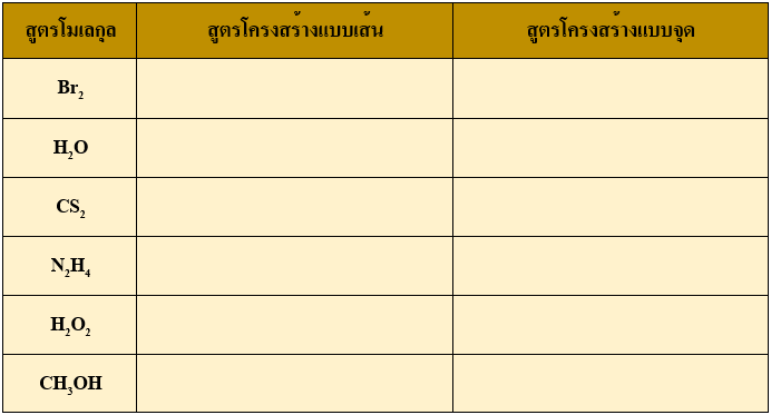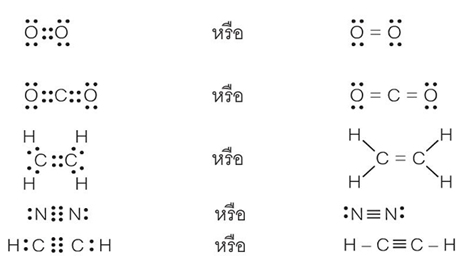 1. สูตรโครงสร้างแบบจุด หรือเรียกว่าโครงสร้างลิวอิส (Lewis structure) เป็นการสร้างพันธะ โดยการนำเอาเวเลนซ์อิเล็กตรอนมาใช้ร่วมกัน โดยการให้หรือ/และรับอิเล็กตรอน 2. สูตรโครงสร้างแบบเส้น มีหลักการเขียนดังนี้ - ใช้เส้นตรง 1 เส้น ( - ) แทนอิเล็กตรอนที่ใช้ร่วมกัน 1 คู่ - ใช้เส้นตรง 2 เส้น ( = ) แทนอิเล็กตรอนที่ใช้ร่วมกัน 2 คู่ - ใช้เส้นตรง 3 เส้น ( º ) แทนอิเล็กตรอนที่ใช้ร่วมกัน 3 คู่ ชนิดของพันธะโคเวเลนต์ สามารถพิจารณาจากจำนวนอิเล็กตรอนที่ใช้ร่วมกันของอะตอมคู่ร่วมพันธะ ดังนี้ 1. พันธะเดี่ยว (Single bond) เป็นพันธะโคเวเลนต์ที่ประกอบขึ้นด้วยอิเล็กตรอนคู่เดียว ทั้งสองใช้อิเล็กตรอนร่วมกัน 1 คู่ ใช้เส้น 1 เส้น ( - ) แทนหนึ่งพันธะเดี่ยว เช่น