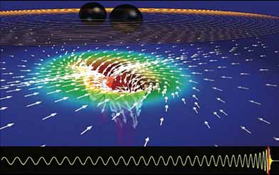 กราฟฟิกแสดงคลื่นความโน้มถ่วงจากระบบดาวคู่ มนุษย์รู้จักแรงโน้มถ่วงมาตั้งแต่สมัยของ เซอร์ ไอแซก นิวตัน แต่ในปลายปี ค.ศ. 1915 อัลเบิร์ต ไอน์สไตน์ได้เสนอทฤษฎีที่จะช่วยอธิบายว่า แรงโน้มถ่วงมีกลไกการทำงานอย่างไร สรุปความโดยย่อแล้ว ทฤษฎีของไอน์สไตน์อธิบายความโน้มถ่วงผ่านความโค้งของอวกาศและเวลา ในทฤษฎีสัมพัทธภาพทั่วไป อวกาศไม่ได้เป็นเพียงเวทีที่แข็งกระด้าง สำหรับให้เหตุการณ์ต่างๆ ในเอกภพ เกิดขึ้น และดำเนินไปเท่านั้น แต่มันยังร่วมแสดงด้วย มันเป็นตัวละครสำคัญในเอกภพของเรา การบิดโค้งของมันกำหนดการเคลื่อนที่ของสสาร และในขณะเดียวกันการมีอยู่ของสสารและพลังงานในจักรวาลก็กำหนดการบิดโค้งของเวลาและอวกาศ ทั้งหมดถักทอประสานเข้าด้วยกันอย่างน่าอัศจรรย์ วัตถุทุกชนิดที่เคลื่อนที่จะเปลี่ยนรูปทรงของกาลอวกาศที่อยู่รอบๆ มัน มวลสารที่เคลื่อนที่ด้วยความเร่ง จะทำให้เกิดการรบกวนในโครงสร้างของเวลาและอวกาศ โดยการรบกวนนี้จะแพร่กระจายออกไปด้วยอัตราเร็วแสง ในรูปของคลื่นที่เรายังไม่เคยตรวจพบมาก่อนจนกระทั่งเมื่อเร็วๆ นี้ เราเรียกมันว่า “คลื่นความโน้มถ่วง” คลื่นความโน้มถ่วงเกิดขึ้นได้อย่างไร หนึ่ง การหมุนรอบของดาวที่มีมวลมาก เช่น ระบบดาวคู่ ไม่ว่าจะเป็น ดาวนิวตรอนสองดวงหมุนรอบกัน หรือแม้แต่หลุมดำสองดวงที่หมุนรอบๆ กัน สอง การระเบิดรุนแรงในอวกาศ เช่น ซุปเปอร์โนวา การชนกันของดาว หรือหลุมดำ การเกิดหลุมดำ การระเบิดรังสีแกมม่า เป็นต้น และ สาม เหตุการณ์การกำเนิดเอกภพหรือบิ๊กแบง ซึ่งจะปลดปล่อยคลื่นความโน้มถ่วงออกมา