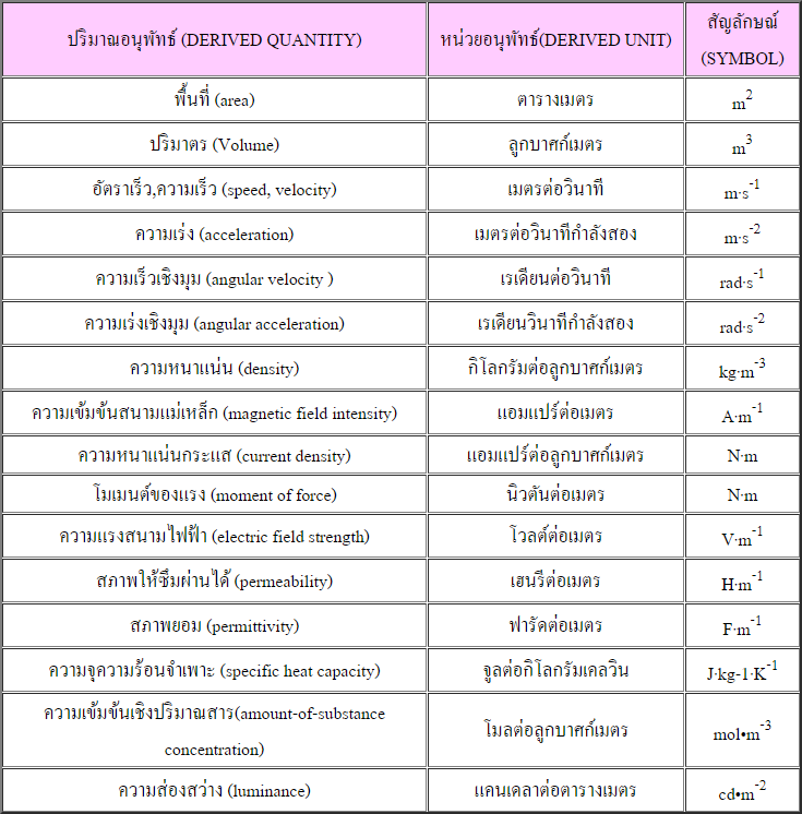 2. หน่วยอนุพันธ์ (Derived Units) เป็นหน่วยซึ่งมีหน่วยฐานหลายหน่วยมาเกี่ยวข้องกัน เช่น หน่วยของอัตราเร็วเป็น เมตรต่อวินาที ซึ่งมีเมตรและวินาที เป็นหน่วยฐาน หน่วยอนุพันธ์มีหลายหน่วยซึ่งมีชื่อและสัญลักษณ์ที่กำหนดขึ้นโดยเฉพาะ เช่น หน่วยอนุพันธ์ (Derived Units) เป็นหน่วยซึ่งมีหน่วยฐานหลายหน่วยมาเกี่ยวข้องกัน เช่น หน่วยของอัตราเร็วเป็นเมตรต่อวินาที ซึ่งมีเมตรและวินาทีเป็นหน่วยฐาน หน่วยอนุพันธ์มีหลายหน่วยซึ่งมีชื่อและสัญลักษณ์ที่กำหนดขึ้นโดยเฉพาะ เช่น