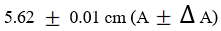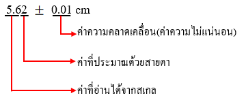 ค่าที่อ่านได้จากการวัดจะต้องอยู่ระหว่าง 5.6 – 5.7 cm ซึ่งสามารถประมาณค่าได้ว่า 5.62 cm หรือ 0.0562 m แต่ค่าที่ได้ออกมานั้นอาจจะไม่ถูกต้อง เพราะการประมาณค่าด้วยสายตานั้นมีโอกาสผิดพลาดได้สูง โดยที่ : ตัวเลขกลุ่มแรกจะเป็นตัวเลขที่วัดได้= A ตัวเลขกลุ่มหลังจะเป็นค่าความคลาดเคลื่อนในการวัด =