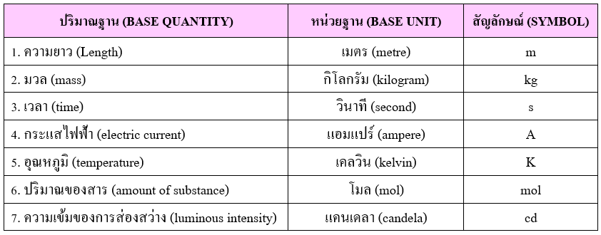 ในวิชาฟิสิกส์ทฤษฎีและกฎต่างๆ ที่ได้ส่วนใหญ่มักแสดงด้วยสมการทางคณิตศาสตร์ ซึ่งอยู่ในรูปความสัมพันธ์ระหว่างข้อมูลเชิงปริมาณ 1. หน่วยฐาน (Base Units) เป็นหน่วยที่ระบบหน่วยวัดระหว่างประเทศกำหนดไว้เป็นพื้นฐาน มีทั้งหมด 7 หน่วย ได้แก่