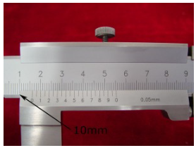 1. อ่านเครื่องหมายเซนติเมตรในระดับคงที่ทางด้านซ้ายของ 0 เครื่องหมายบนสเกลเวอร์เนีย (10mm บนคงที่คาลิปเปอร์)
