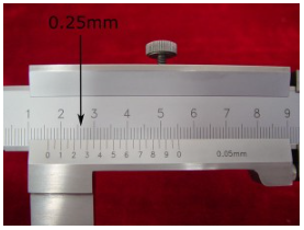 3. ดูตามเครื่องหมายบนสเกลเวอร์เนียและเครื่องหมายมิลลิเมตรในระดับคงที่ที่อยู่ติดกันจนกว่าคุณจะพบว่าเส้นสองมากที่สุดเกือบ (0.25mm บนสเกลเวอร์เนีย) อ่านค่าเวอร์เนียหลัก 2