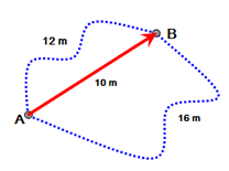 ตามรูป แสดงการเคลื่อนที่ของวัตถุ 2 แบบ ตามแนวเส้นทางการเคลื่อนที่โดยระยะทางของการเคลื่อนที่เท่ากับ 12 และ 16 เมตร แต การกระจัดของการเคลื่อนที่ทั้งสองมีจุดเริ่มต้น และจุดสุดท้ายเป็นจุดเดียวกันเวกเตอร์การกระจัดทั้งสองจะมีค่าเท่ากัน คือ 10 เมตร