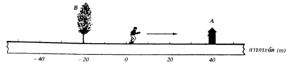 วิธีทำ การที่ชายคนนั้นวิ่งจากจุดเริ่มต้นไป A แล้วย้อนกลับไปหยุดที่จุดใต้ต้นไม้ B จะได้การกระจัดทั้งสิ้นเท่ากับ s โดยที่ s = -20 m ตามนิยามของความเร็วเฉลี่ยจะได้ความเร็วเฉลี่ย
