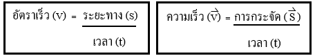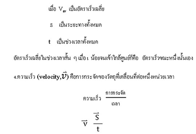 อัตราเร็ว (speed,V) คือ ระยะทางที่เคลื่อนที่ได้ในหนึ่งหน่วยเวลา เป็นปริมาณสเกลาร์ มีหน่วยเป็น(Speed) เมตร/วินาที (m/s) อัตราเร็วเฉลี่ย คือ อัตราเร็วที่จุดกึ่งกลางของช่วงเวลานั้น หาจากอัตราส่วนของระยะทางกับ(Average Speed) เวลาเป็น ปริมาณสเกลาร์ มีหน่วยเป็น เมตร/วินาที (m/s) อัตราเร็วเฉลี่ย เป็นการประมาณค่าซึ่งค่าแท้จริงอาจจะมากกว่าหรือน้อยกว่าค่านี้ก็ได้