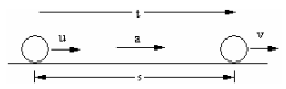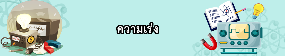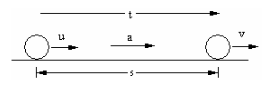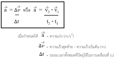 ความเร่ง คือ ความเร็วที่เปลี่ยนไปในหนึ่งหน่วยเวลาเป็นปริมาณเวกเตอร์หรืออัตราการเปลี่ยนความเร็ว เมื่อวัตถุมีความเร่งในช่วงเวลาหนึ่ง ความเร็วของมันจะเปลี่ยนแปลงไป ความเร่งอาจมีค่าเป็นบวกหรือลบก็ได้ ซึ่งเรามักว่าเรียก ความเร่ง (+a) กับ ความหน่วง (-a) ตามลำดับ ความเร่งมีนิยามว่า "อัตราการเปลี่ยนแปลงความเร็วของวัตถุในช่วงเวลาหนึ่ง" โดยสามารถเขียนเป็นความสัมพันธ์ระหว่างความเร็ว และเวลาได้ว่า คำนิยามของความเร่งขณะหนึ่ง และความเร่งเฉลี่ย ความเร่งขณะหนึ่ง คือ ความเร่งในช่วงเวลาสั้นๆ ความเร่งเฉลี่ย คือ อัตราส่วนระหว่างความเร็วที่เปลี่ยนไปทั้งหมดกับช่วงเวลาที่เปลี่ยนความเร็วนั้น โดยในส่วนของ 2 สมการหลัง [(3) และ (4)] เป็นการนำสองสมการแรก [(1) และ (2)] มาแทนค่ากันและกันโดยสมการที่ 3 เป็นการแทนค่า v จากสมการที่ 2 ลงในสมการ 1 ส่วนสมการที่ 4 เป็นการแทนค่า t จากสมการที่ 2 ลงในสมการ 1 เมื่อกำหนดให้ s = ระยะทาง (m) รูปแสดงการเคลื่อนที่แบบมีความเร่ง ตามรูปแล้วมีวัตถุมวล (m) ความเร็วต้น (u) เคลื่อนที่ไปในระยะเวลา (t) ได้ระยะทางเท่ากับ (s) จนมีความเร็วปลาย (v) ซึ่งขณะที่กำลังเคลื่อนที่มีอัตราเร่ง (a) เกิดขึ้น ซึ่งเป็นแบบทั่วไปในการใช้ตั้งคำถามเกี่ยวกับการเคลื่อนที่แบบมีความเร่ง ตัวอย่างการใช้สมการในการคำนวณเรื่องการเคลื่อนที่แบบมีความเร่ง