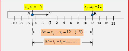 จากภาพ แสดงการเคลื่อนที่ของวัตถุหนึ่ง เริ่มจากตำแหน่ง A(-5 ) ไปทางขวา (+x) ถึงตำแหน่ง B(+12) การกระจัด Δx = xf - xi = 12 - (-5) = 17 เวลา Δt = tf - ti = ........... .......................................................................................................................................... ตัวอย่าง 2 วัตถุหนึ่งเริ่มเคลื่อนที่ด้วย ความเร่ง 3 เมตร/ (วินาที)2 นานเท่าไรวัตถุจะมีความเร็วเป็น 18 เมตร/วินาที ..........................................................................................................................................