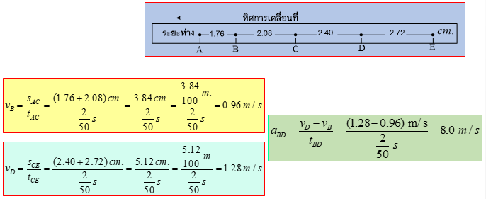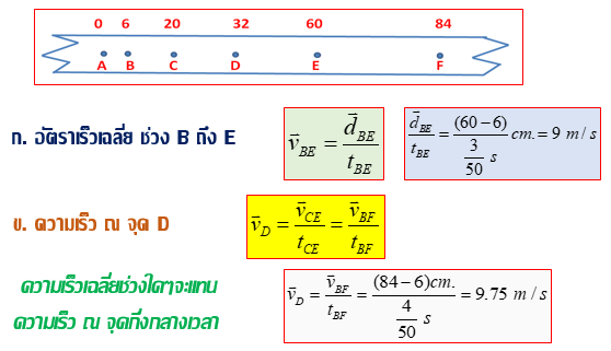 1.ความเร็วเฉลี่ย ช่วง A-E จะแทนความเร็ว ณ จุด C 4.ความเร่ง ณ จุด E หาได้จาก ความเร่งเฉลี่ย ช่วง ตัวอย่างที่ 9 จากการวัดระยะทางใน 2 ช่วงจุด ณ เวลาตรงจุดกึ่งกลางแต่ละช่วง บนแถบกระดาษที่ถูกดึงผ่านเครื่องเคาะสัญญาณเวลา ได้ข้อมูลดังตาราง จงหา ความเร่งเฉลี่ย ณ เวลา 4/50 วินาที