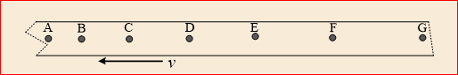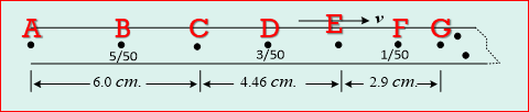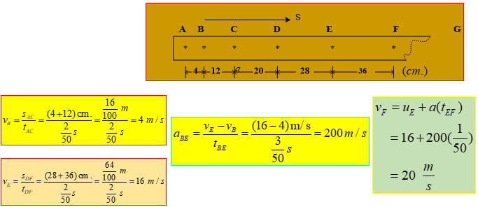 ตัวอย่างที่ 8 จากแถบกระดาษผ่านเครื่องเคาะสัญญาณเวลาชนิดที่มีความถี่ 50 เฮิรตซ์ ได้รอยจุดปรากฏดังรูป อัตราเร็ว ณ จุด F มีค่าตรงกับข้อใด แนวคิด