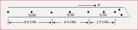 ตัวอย่างที่ 7 จากรูปแถบกระดาษที่ได้จากเครื่อง Ticker timer ดังแสดง จงคำนวณหา ความเร่ง ของแถบกระดาษนี้ แนวคิด