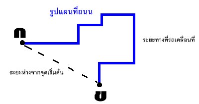 ชายคนหนึ่งเดินจาก ก ไป ข แล้วจาก ข ไป ค และไป ง ชายคนนี้จะได้ระยะทาง = 6 + 3 + 2 เมตร = 11 เมตร ชายคนนี้จะได้การกระจัด = 5 เมตร ตัวอย่างที่ 2