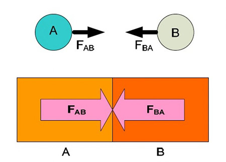 กฎการเคลื่อนที่ข้อที่ 3 ของนิวตัน กล่าวว่า "ทุกแรงกิริยาย่อมมีแรงปฏิกิริยาซึ่งมีขนาดเท่ากัน แต่มีทิศตรงข้ามกันเสมอ กฎข้อนี้เรียกว่า กฎของกิริยาและปฏิกิริยา (Law of action and reaction) แรงกิริยาและแรงปฏิกิริยาหมายถึง แรงกระทำและแรงกระทำตอบ โดยเป็นแรงซึ่งกระทำต่อ มวลที่ต่างกัน และเกิดขึ้นพร้อมกันเป็นคู่เสมอ โดยที่มวลอาจไม่สัมผัสกัน และถือว่าแรงหนึ่งแรง ใดเป็นแรงกิริยาและแรงปฏิกิริยาก็ได้ จากรูป FAB คือแรงที่ A กระทำบน B และ FBA คือ แรงที่ B กระทำบน A FAB = - FBA ขอบคุณเนื้อหาเพิ่มเติม |