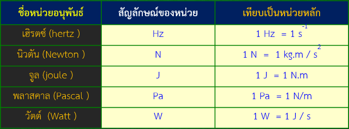 หน่วยมูลฐาน (Base Unit) 1. เมตร (Metre) คือ ความยาวของทางเดินของแสงในสุญญากาศในช่วงเวลา 1/299 792 458 ของหนึ่งวินาที 2. กิโลกรัม (Kilogram) คือ หน่วยมวลสาร ซึ่งมีค่าเท่ากับมวลสารต้นแบบระหว่างประเทศ 1 กิโลกรัม (the international prototype of the kilogram) 3. วินาที (Second) คือ ช่วงระยะเวลาเท่ากับ 9 192 631 770 คาบของคลื่นของการแผ่รังสีที่สมนัยกับการเปลี่ยนระดับไฮเปอร์ไฟน์ (hyperfine levels) 2 ระดับของอะตอมซีเซียม-133 ของสถานะพื้นฐาน (the ground state of the cesium 133 atom) 4. แอมแปร์ (Ampere) คือ ค่ากระแสไฟฟ้าคงที่ และรักษาให้คงที่เมื่อปล่อยค่ากระแสไฟฟ้า 5. เคลวิน (Kelvin) เป็นหน่วยของอุณหภูมิเทอร์โมไดนามิกส์ (Thermodynamic temperature) มีค่าเท่ากับ 1/273.16 ของอุณหภูมิเทอร์โมไดนามิกส์ 6. โมล (Mole) คือ ปริมาณมวลสารย่อย (amount of substance) ของระบบที่ประกอบด้วยองค์ประกอบมูลฐาน (elementary entities) หลายองค์ประกอบ มีจำนวนเท่ากับจำนวนอะตอมของคาร์บอน-12 หนัก 0.012 กิโลกรัม จะใช้โมลก็ต่อเมื่อมีการกำหนดองค์ประกอบมูลฐาน และอาจเป็น อะตอม(atoms), โมเลกุล (molecules), ไอออน (ions), อิเล็กตรอน (electrons), อนุภาคอื่นๆ (other particles) หรือ กลุ่มจำเพาะเจาะจงของอนุภาคดังกล่าว 7. แคนเดลา (Candela) คือ ความเข้มการส่องแสง (luminous intensity) ในทิศทางที่กำหนด ความเข้มการส่องแสงของแหล่งกำเนิดซึ่งปลดปล่อยรังสีเอกรงค์ (monochromatic radiation) ด้วยความถี่ 540 x 1012 เฮิรตซ์ และมีความเข้มของการแผ่รังสีในทิศทางดังกล่าวเท่ากับ 1/683 วัตต์ต่อสเตอเรเดียน(watt per steradian) 1.2 ปริมาณอนุพันธ์ (derived units) ปริมาณอนุพันธ์ (derived units) คือปริมาณที่เกิดจากความสัมพันธ์ของปริมาณมูลฐาน