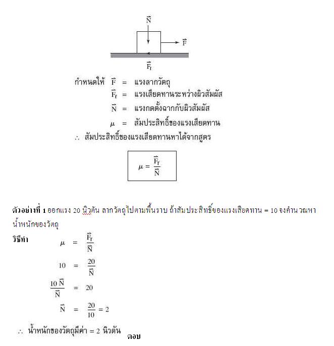 7. แรงเสียดทานไม่ขึ้นอยู่กับขนาดหรือพื้นที่ของผิวสัมผัส การคำนวณหาสัมประสิทธิ์ของแรงเสียดทาน สัมประสิทธิ์ของแรงเสียดทานระหว่างผิวสัมผัสคู่หนึ่งๆ คือ อัตราส่วนระหว่างแรงเสียดทานต่อแรงกดตั้งฉากกับผิวสัมผัส