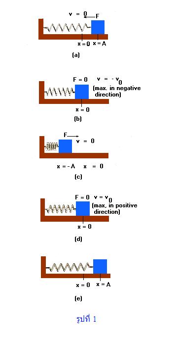 ในรูปที่ 1a ตำแหน่ง x = 0 เป็นตำแหน่งสมดุลของปริง หรือ เป็นตำแหน่งที่สปริงมีความยาวตามปกติ ณ ตำแหน่งนี้สปริงจะไม่ส่งแรงมากระทำต่อวัตถุ ในรูปที่ 1aนี้มีวัตถุมวล m ผูกติดกับสปริง วางอยู่บนพื้นที่ซึ่งไม่มีแรงเสียดทาน ที่ตำแหน่งซึ่งปริงยืดออกจากความยาวปกติเป็นระยะทาง A สปริงจะออกแรงดึงวัตถุมวล mกลับมาอยู่ในตำแหน่งสมดุล x = 0 เรียกแรงที่สปริงกระทำต่อวัตถุนี้ว่าแรงดึงกลับ (Restoring force) ถ้า F เป็นแรงดึงกลับนี้จะได้ว่า F = -kx -----(1)