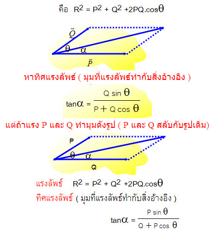 2.4 มี 2 แรงทำมุม θ หาขนาดของแรงลัพธ์โดยใช้สี่เหลี่ยมด้านขนานให้แรงทั้งสองเป็นด้านประกอบ ของสี่เหลี่ยมด้านขนาน