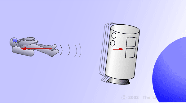 หากเราออกแรงถีบยานอวกาศในอวกาศ ทั้งตัวเราและยานอวกาศต่างเคลื่อนที่ออกจากกัน (แรงกริยา = แรงปฏิกิริยา) แต่ตัวเราจะเคลื่อนที่ด้วยความเร่งที่มากกว่ายานอวกาศ ทั้งนี้เนื่องจากตัวเรามีมวลน้อยกว่ายานอวกาศ (กฎข้อที่ 2) ดังภาพที่ 6