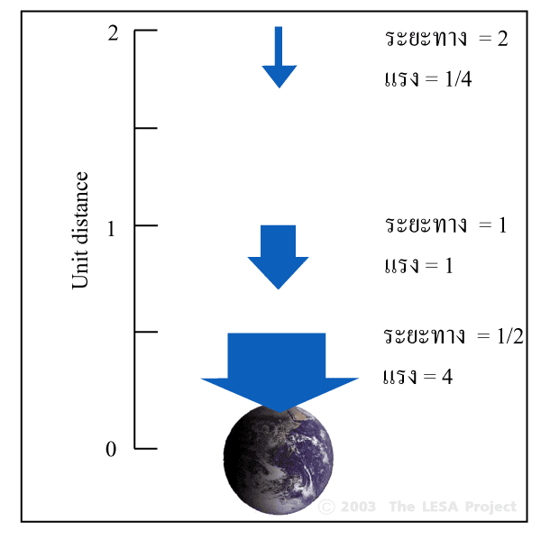 ตัวอย่าง : เมื่อระยะทางระหว่างวัตถุเพิ่มขึ้น 2 เท่า แรงดึงดูดระหว่างวัตถุจะลดลง 4 เท่า ดังที่แสดงในภาพที่ 6 เขาอธิบายว่า การร่วงหล่นของผลแอปเปิล ก็เช่นเดียวกับการร่วงหล่นของดวงจันทร์ ณ ตำแหน่งบนพื้นผิวโลก สมมติว่าแรงโน้มถ่วงบนพื้นผิวโลกมีค่า = 1 ระยะทางจากโลกถึงดวงจันทร์มีค่า 60 เท่าของรัศมีโลก ดังนั้นแรงโน้มถ่วง ณ ตำแหน่งวงโคจรของดวงจันทร์ย่อมมีค่าลดลง = (60)2 = 3,600 เท่า