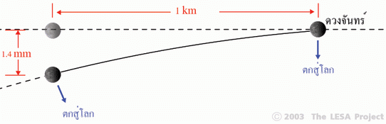 ในภาพที่ 8 แสดงให้เห็นว่า ใน 1 วินาที ดวงจันทร์เคลื่อนที่ไปได้ 1 กิโลเมตร จะถูกโลกดึงดูดให้ตกลงมา 1.4 มิลลิเมตร เมื่อดวงจันทร์โคจรไปได้ 1 เดือน ทั้งแรงตั้งต้นของดวงจันทร์ และแรงโน้มถ่วงของโลก ก็จะทำให้ดวงจันทร์โคจรได้ 1 รอบพอดี เราเรียกการตกเช่นนี้ว่า “การตกแบบอิสระ” (Free fall) อันเป็นหลักการซึ่งมนุษย์นำไปประยุกต์ใช้กับการส่งยานอวกาศ และดาวเทียม ในยุคต่อมา
