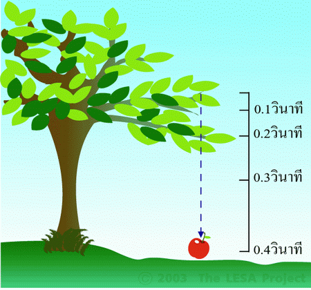 ณ ตำแหน่งพื้นผิวโลก วัตถุจะร่วงหล่นสู่พื้นด้วยความเร่ง (9.8 เมตร/วินาที)/วินาที ภาพที่ 8 แสดงให้เห็นว่า ความเร็วของแอปเปิลเพิ่มมากขึ้นในแต่ละช่วงเวลา 0.1 วินาที