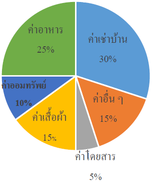 แผนภูมิรูปวงกลมแสดงค่าใช้จ่ายของนายกวี มีเงินเดือน 6,000 บาท ประจำเดือนกุมภาพันธ์ 2550 เป็นดังนี้