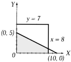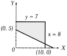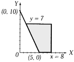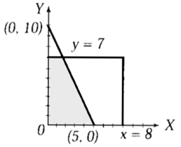 | 3. ข้อใดคือกราฟของระบบอสมการ 0 ≤ x ≤ 8, 0 ≤ y ≤7 และ 2x + y ≥ 10 |