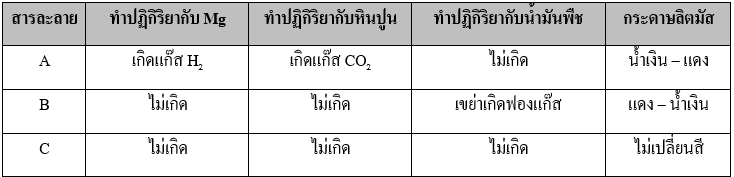 15. นักเรียนนำสารตัวอย่างมาทดสอบความเป็นกรด – เบส ซึ่งได้ผลการทดลองดังตาราง