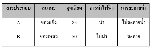 2. ตารางแสดงสมบัติของสารประกอบ A และ Bสารตัวอย่าง ซึ่งมีสาร A, B และน้ำ ปนกันอยู่ จะแยกสาร A และ B ออกจากกันได้รวดเร็วที่สุดด้วยวิธีใด