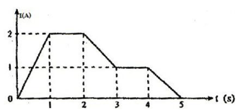 1. จากรูปเป็นกราฟแสดงไฟฟ้าที่ไหลผ่านลวดเส้นหนึ่งกับเวลาจงหาว่าเมื่อสิ้นสุดเวลา t = 5 วินาทีจะมีประจุไฟฟ้าไหลผ่านลวดเส้นนี้ กี่คูลอมบ์